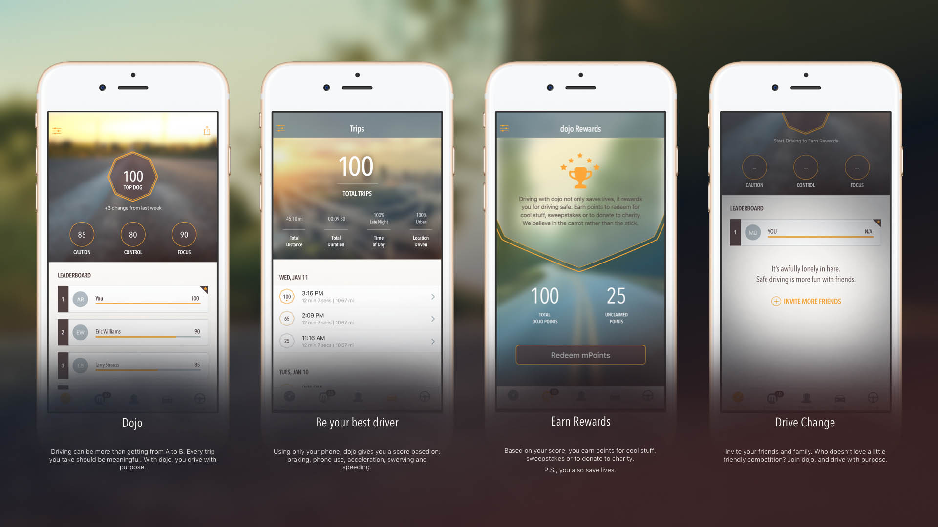 Dojo uses the sensors in you mobile phone to measure your driving skills and gives you a drive score based on how well you drive. The better you drive, the more rewards you earn. Dojo also lets you invite friends and family to play along so you can see who truly is the better driver. Dojo: drive with purpose.