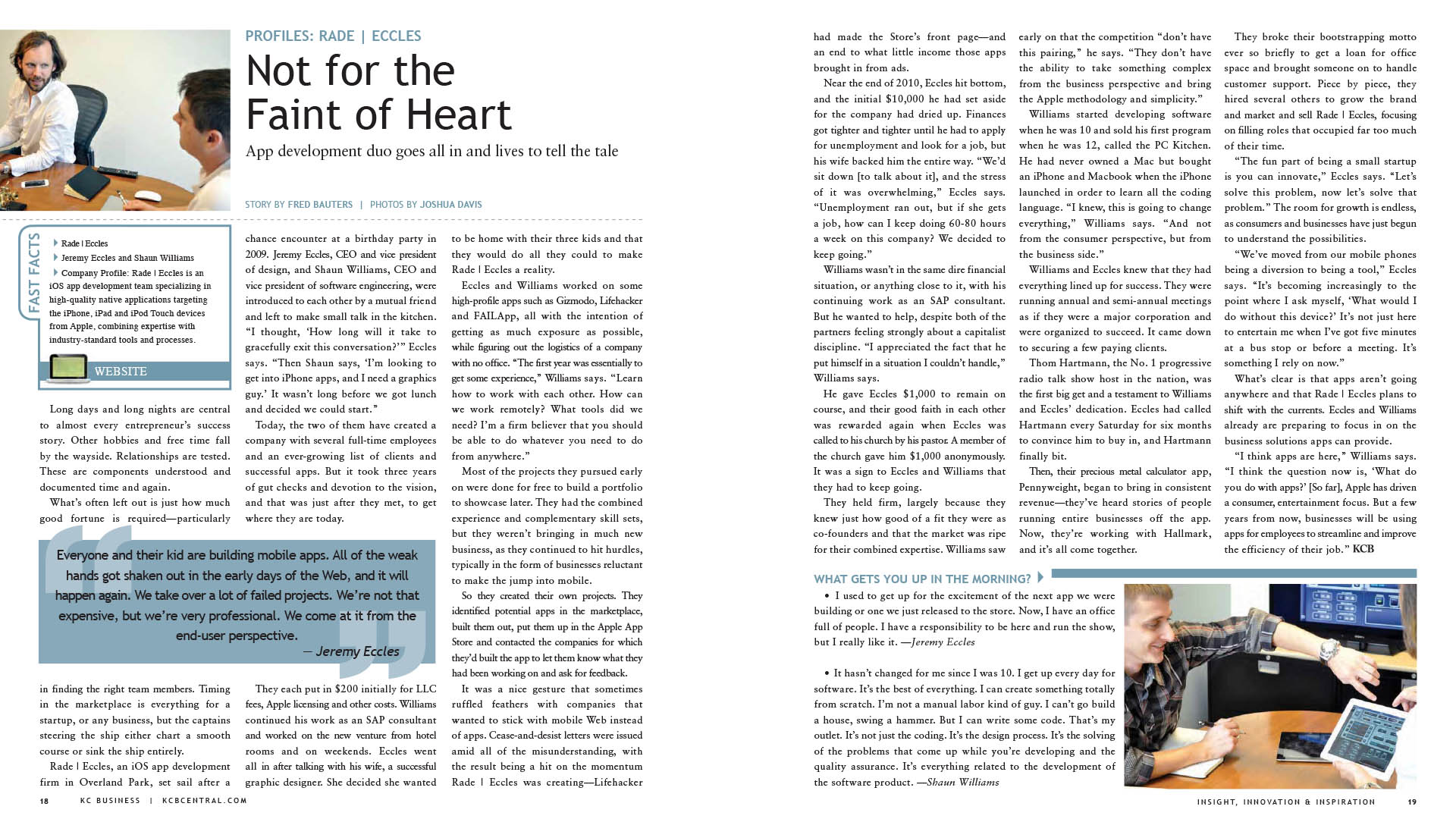 “We’ve found a true entrepreneurship story in Rade | Eccles (p. 18). The iOS app development and consulting firm began as two acquaintances who realized their skills complemented each other unbelievably well. That evolved into tireless effort from both to work long days and nights at home with no assurances that business and revenue would come in. They gave away their services for free at first to build their name, one of them living below the poverty level, and now they’re roaring full-speed ahead with a bevy of clients.”